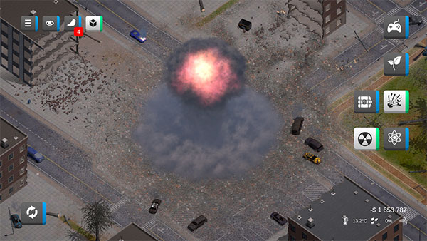同时游戏中玩家可以操纵多种种史诗级灾难来破坏城市,如地震、龙卷风、核武器、外星飞船等,玩家可以自由选择,随意的对城市进行破坏,释放你埋藏已久的负面情绪。