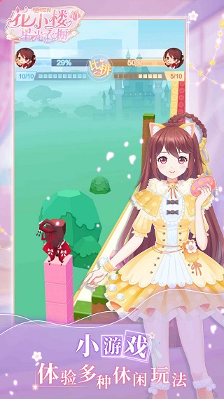 花小楼的星光衣橱官方版是一款迷妹版的次元美女换装养成游戏,游戏主角以《迷你世界》大热IP花小楼创作,在这里你不仅能为花小楼穿搭各种搭配,还能进行趣味直播,或是体验多种休闲小游戏,相比《怪物女孩换装》来讲,无论是画风的高清精美,还为亮点玩法的共同存在,都将是玩家不可错过的重点选择!除了这些,玩家还能参与花小楼晋级、赶通告,收藏图鉴,甚至是合成,影视城等其他玩法,万千造型,有趣剧情,花小楼的星光由你点亮!