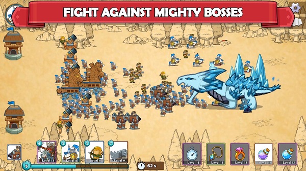 成功进入关卡后,在界面的左侧下方,分别是你可用的队伍,蓝色条能是你的能量,不同队伍的招募需要对应的能量才能进行,比如炮兵需要4格、弓箭手需要3格、地雷需要2格、骑兵需要3格,后续玩家还能解锁更多兵种。关于放置,只要满足一定的能量后,拖动屏幕上的兵种到战场上即可。