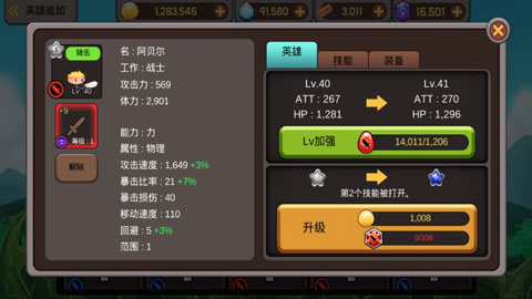 英雄界面中通过使用英雄石可雇佣各种英雄,这里的英雄主要分为力量、敏捷、智力和体力四大类型,且具备等级、技能、武器等要素,利用各种道具可进行英雄升阶,武器可进行强化,而且技能的数量与英雄品阶息息相关。