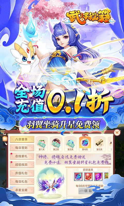 武林秘籍官方版是一款以古代武林为背景的MMORPG,它有着精美的画面,深度养成和搭配的策略,还有着丰富的玩法和社交互动功能,为你带来绝佳的游戏体验。在这款游戏中,你将扮演一位修仙者,开局加入宗门,为他们效力,在游戏过程中你可以召唤众多神将来和你组队,为你保驾护航,你在推动主线剧情的时候可以获得海量资源培养自己的神将,让他们更强。游戏内玩法众多,门派技能、修炼、装备打造、合成、境界提升、玩家交易、全红战王、竞技场等特色系统等你来解锁,让你能书写属于自己的传奇故事。除此之外,现在上线还送海量养成装备,所有充值都是0.1折,让你可以秒升120级,轻松霸榜,赶紧来下载体验一下吧!