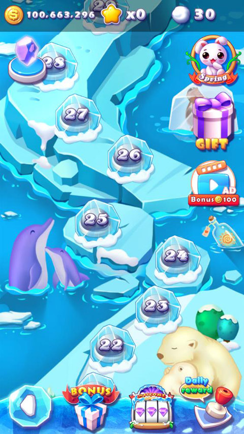 简单且经典的消除玩法,玩家只需通过滑动屏幕,将三个或者三个以上相同颜色相同形状的冰块移动摆放在一起即可达到消除效果,只要用有限的步数完成每关的通关任务,就可以轻松的通关啦。