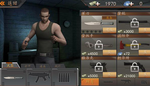 然后一次就是一个剧情模式以及生存模式,剧情模式就是过任务,赚钱购买装备,然后解锁下一个任务,直到逃出监狱。这里达菲鸡要重点说明一下,游戏整体来说剧情还是很不错的,唯一的嘈点就是这里的剧情达菲鸡还以为是那种3D动漫类型的剧情模式,可惜的是游戏是那种普普通通的对话框,这一点相对于大型3D游戏例如:《侠盗飞车之罪恶都市》之类的大型3D游戏来说还是比较可惜的,但是仔细想想如果这里面有那种剧情模式的话估计要腾出很多内存来下载了,而且这款游戏模式单调,这样一来就会损失很多的玩家。