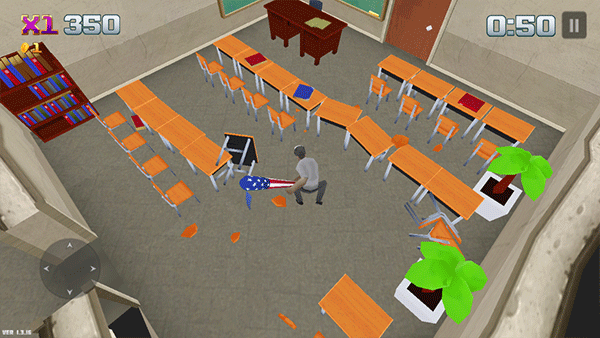 游戏的终极目的就是想尽办法破坏学校,教室、办公室、食堂、体育馆等场景不限定,凳子、桌子、储物箱、电脑等物品随便摔、随便砸,更能借助灭火器爆炸,造成更加强大的破坏力,破坏程度越大,分数就越高,让你尽情发泄对学校的不满,享受疯狂破坏的刺激。