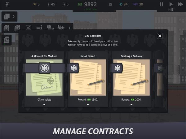第四天,二层全部修建完成,基本型办公室完成,接50人口任务。目标:40人口,修建3楼,地下一层左侧。商户可能会需求瓶装水和办公用品服务,记得预留资金,适时修建。40人口会提升信誉2级。解锁中型办公室和商店,但是这两个需求很高,前者需要多项服务,后者需要仓库,这都需要雄厚资金。而我现在只有1000多块,还需要完成任务来累积资金。所以继续把3层修建为小型办公室是不错的选择。毕竟瓶装水和办公用品的支出要有所回报才是。