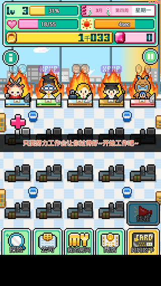 这个游戏的白天和黑夜都是十秒,每过一个月玩家需要支付一次工资,没有拿到工资的“沃克梦”在这个月之后会选择离开公司,所以千万要保证你挣的钱不至于拖欠员工工资。不想要的员工你可以直接解雇他,为更好的员工腾出办公桌,因为解锁新的办公桌的费用会越来越高,所以控制好你的钱。