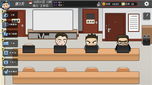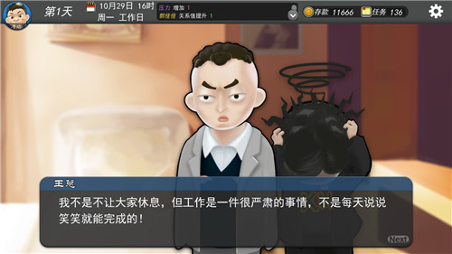 记得去加班别休息,除了第一周的两天之外,压力过大就用就找一个人用“恶语”,健康值不足就中午休息加两健康值。