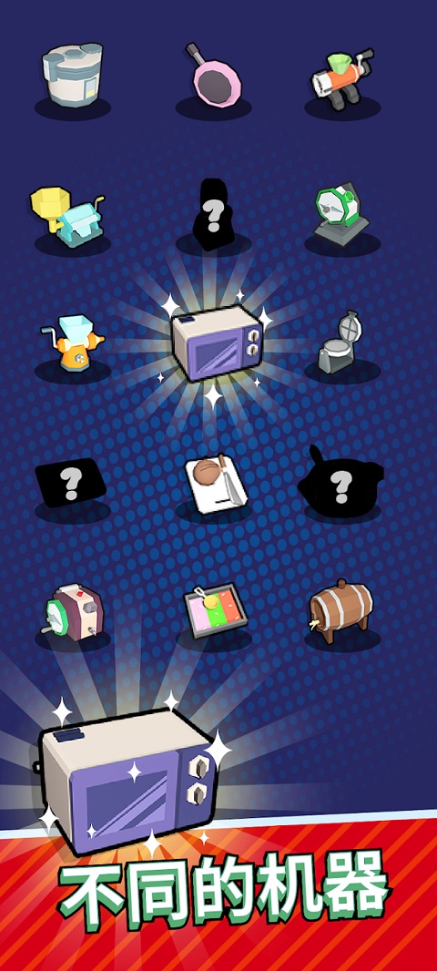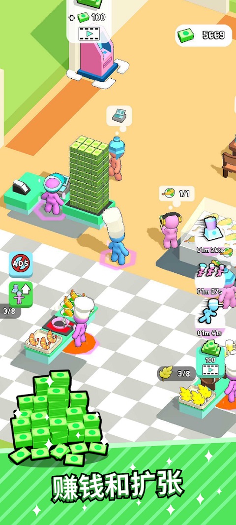 2、一旦你收集了足够的钱,你将扩大你的团队,堆叠更多的食物原料,升级你的食物制造机器!