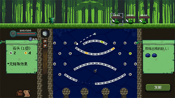 哥布林弹球游戏的玩法也是比较的富有创意性,在每一局开始的初始配置为三枚石头与一枚小刀,为了鼓励玩家体验不同功能弹珠的效果与联动,玩家在每回合开始时有一次跳过当前弹珠并使用下一枚弹珠的机会,大多数弹珠还是伤害力十足的,不过也有较为“鸡肋”的弹珠,例如“爆炸弹珠”,需要击中钉子8次才能够增加杀伤力,但是还是需要玩家去挑选,自己觉得称手才是最合适的。