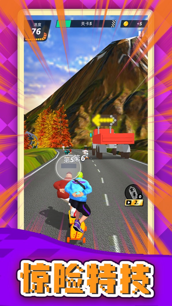 1、技能追逐: 玩家可以通过提高滑板速度、机动性和能力,在比赛中脱颖而出,还可以通过游戏能够进行体验更多内容。