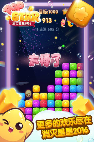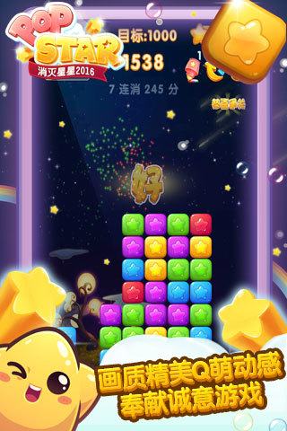 《消灭星星2016》是一款全球玩家都爱玩的经典消除游戏。在游戏舒缓的节奏中,只需用手指轻轻点击两个以上相同颜色的星星,即可顺利消除。消灭星星2016的画风清新可爱,用精致的画面带给你好的视觉享受。消灭星星2016给玩家带来更好的体验。喜欢萌系卡通风格的你一定不能错过!