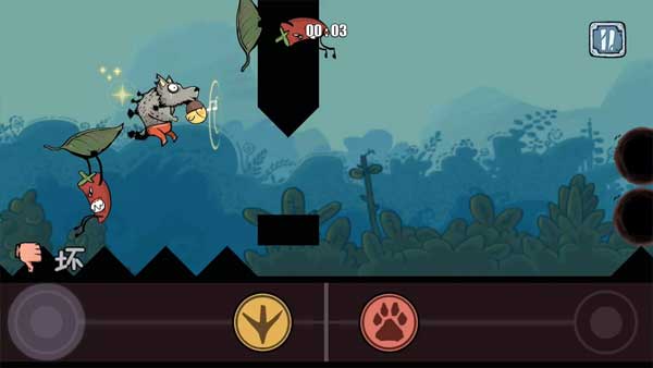2、这款游戏的玩法是双角色组合,左边屏幕用来控制小鸟小吉,右边屏幕控制阿烈。