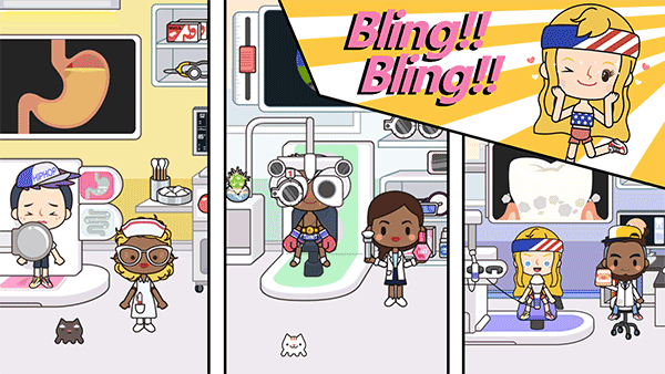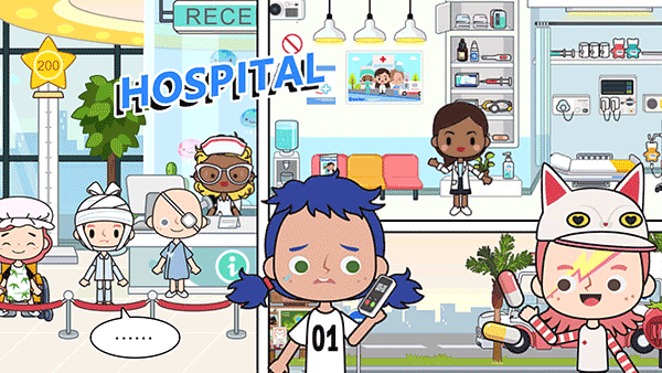 在医院开始时,有一个接待区,病人可以坐下来等待。您可以与自动售货机,自动取款机或水族馆互动,享受乐趣。从接待处获取信息或假装为接待员。从饮水机喝水,与工具笔记本电脑和许多其他东西互动。镇诊所在医院有MRI,X光和超声实验室,您可以在那里进行不同的医学检查。患者需要X光和超声波治疗。找到问题并放置绷带或给药以使他们感觉更好。您可以与打印机交互以获取报告的打印件。通过将包装纸和垃圾倾倒在垃圾箱中来清理实验室。更换实验室床单并安排轮椅。去幼儿园,小心翼翼地爱着这个世界的新生儿。喂宝宝,换尿布,回家之前一起玩。此外,你可以改变这些小衣服,给他们洗澡和医疗护理,让他们在这个世界上保持健康和快乐。物理治疗室将有用于物理治疗的仪器和机器,如跑步机试验机,称重机,瑜伽垫等等。您可以通过角色锻炼测试他们的身体限制,在这个健身房像房间一样娱乐。检查他们的体重,BMI和其他身体测试。训练像健身房这样的人物,使他们健康。