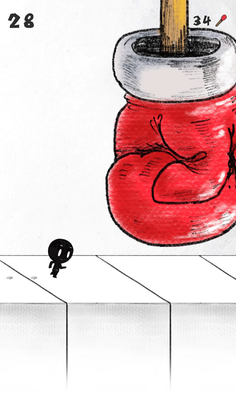 第二个机关随机出现拳套或者旋转不停的刀片;首先介绍一下刀片,由于火柴人跑的快,而刀片转速慢,所以不加调整就过不去了。通过的方法是火柴人跑到刀片下方后快速点击两下手机屏幕,稍微一减速,过去正好。