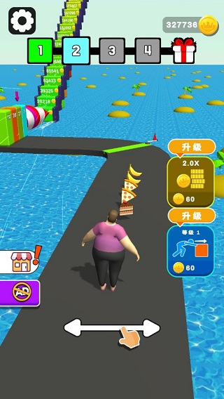 简单的玩法,仅凭一根单指就能进行操作,直白来讲就是仅需要控制角色左右跑动即可。玩家在关卡中的跑道上左右移动,或是收集金币、或是吞食各种美食,为前方的障碍积累足够的脂肪,避免遇到较大数字的时候,因为自身脂肪不足而闯关失败。是的,你没有看错,当玩家的角色脂肪不足且遇到数字较大的障碍时,角色最终会从壮硕的成年人逐渐瘦弱下去,最终变得瘦骨嶙峋而倒地不起。