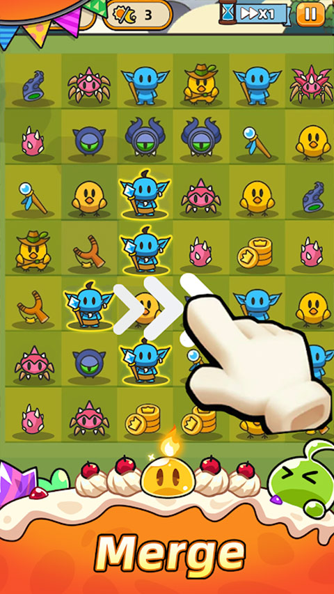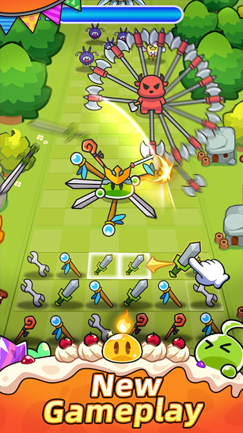 合合合英雄游戏是一款集塔防、消除与卡牌元素为一体的Rouglike游戏,英文名也叫Slime Legion,基于经典“三消”规则,玩家只需在限定步数内合成更多英雄来抵御魔物入侵即可。英雄的类型与基础物品有关,如弹弓可以合成投蛋手,法杖可以合成冰霜,触手可以合成小恶魔,宝剑则可以合成史莱姆。