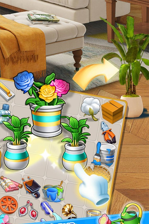 2、当金钱不足时,点击右下角进入消除小游戏。在这里拖动两个相同的工具将它们合并在一起,灰色的是无法直接拖动,只能被动合并,完成上方的工具任务时就可以获得金钱去进行装修。