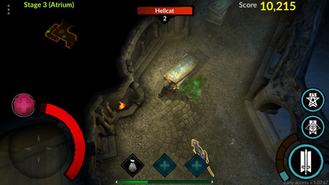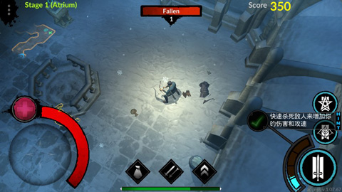 1、异端神的控制系统是直观的,并且很好地适应触觉设备。随着屏幕左侧的虚拟横梁你可以移动你的性格,而在右侧的按钮,你可以攻击和使用技能。只需按下按钮的攻击,你的英雄会自动瞄准最近的敌人。