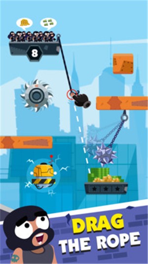 救救强盗玩家在这个游戏中将通过一个又一个绳索拯救强盗,让强盗们成功的逃离危险的地方,但是这个也不是那么的轻松简单的,需要玩家动用自己聪明的脑袋瓜子去想办法,只要合理的利用就可以帮助小强盗逃脱,玩法还是很简单的,解救小强盗们是玩家的主要游戏任务,完成就可以进入下一关。