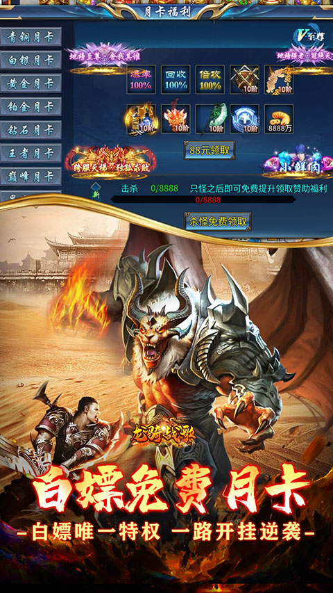 1、免费月卡:所有档位全可靠击杀怪物激活,全部都可以白嫖,虽然免费,全是好货!