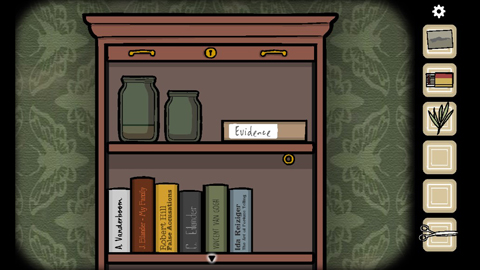 柜子上有个复读机,看来是放磁带的。旁边有打字机。还有一株植物。用剪子可以剪下来树叶。还有门旁边的开关开灯。灯里面有照片碎片。