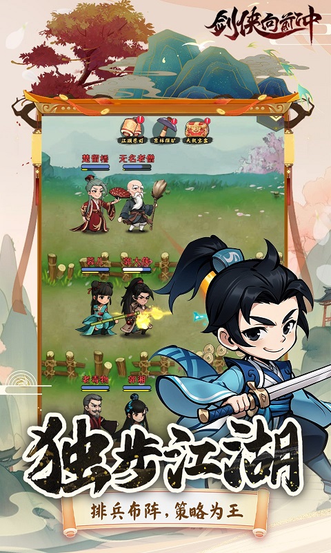 剑侠向前冲是一款Q版武侠风卡牌放置类手游。在此游戏中,玩家穿越当掌门,结识各种武林侠客角色,如令狐聪、郭大侠、郭襄、老毒物等,邀请他们加入自己的战斗队伍,提升队伍的战斗实力,守护江湖。游戏可开启自动战斗模式,掉落宝箱开不停,获得的金币提升侠客属性,使用进阶丹可以突破侠客自身瓶颈。还拥有独特的传功系统,将一位侠客的等级、装备、悟道、淬炼、秘籍、魂石、宠物传功给另一位侠客,实现战力资源的优化配置,但侠客品质,星级不会被传递。