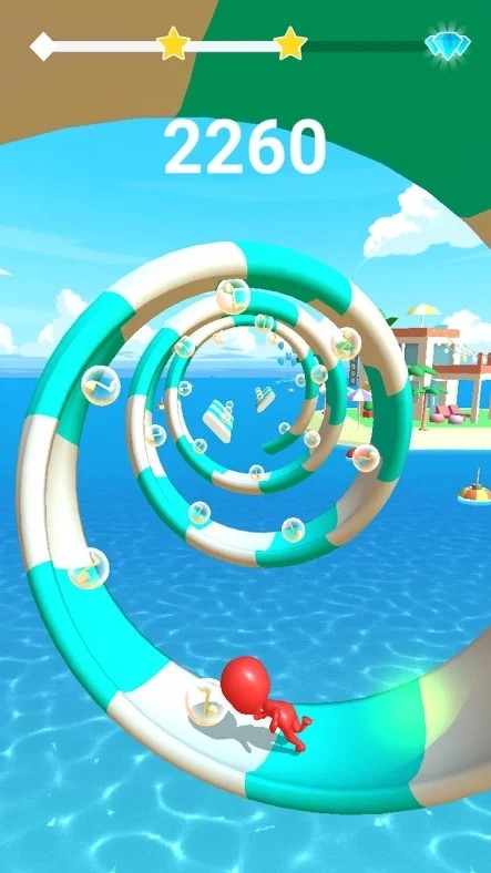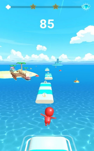 1、一键式触摸玩法,拖动舞者开始奔跑跳跃,保证舞者一直在瓷砖上运行,不要掉落到水中