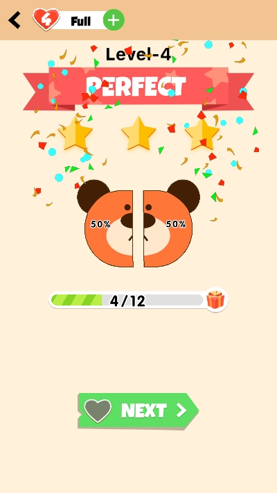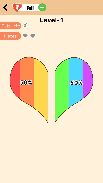 平均切它在这里需要玩家做的就是把关卡内的物品无差别切割,征服新的水平。拥有自己的游戏方式,一道能够准确的切割。即使通过只用一个单一的切削行程的挑战。每一关的要求是不一样的,玩家只要跟着要求来就可以了,难度不是很大,但是这个切割不同以往的切割游戏,它的任务目标是把目标物品平均切开,多一点或少一点都不能拿到最高奖励。