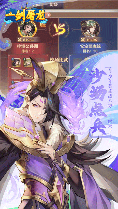 一剑屠龙官方正版是一款以三国历史为背景的策略卡牌手游,其细腻的特效建模和如梦如幻的背景设计,构建了一个充满玄幻色彩的3D世界。在这个世界中,玩家将跟随着丰富的剧情走向,通过一系列的任务和挑战,逐步提升自己的部队实力,玩家将逐步将关羽、张飞、赵云、吕布等三国猛将收入麾下,招兵买马,扩充城池,在这个三国乱世中站稳脚跟,徐徐发展,最后一统天下。