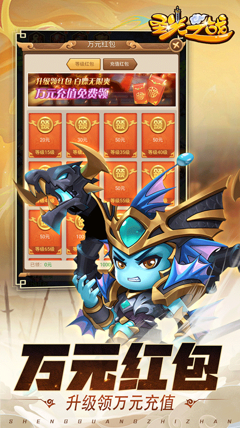在游戏中,我们将扮演一位穿越至三国的普通人,在这个充满硝烟和战火的时代,我们需要运用自己的谋略与聪明才智结识那些鼎鼎有名的三国名将,邀请他们共议大事,统一这个三国乱世。另外,圣光之战游戏还有挂机系统,玩家即使没有在线上也会帮助你不停的闯关,从而轻松获取到海量的游戏宝箱,另外游戏内还有着海量的福利活动等待你的参与。