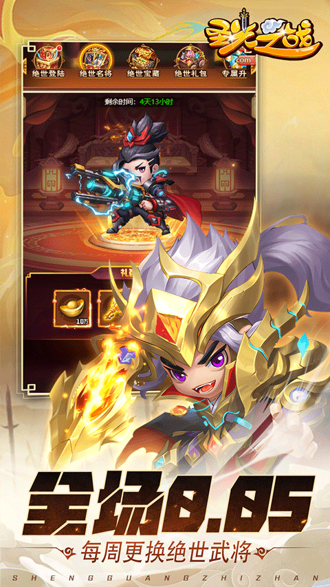 圣光之战是一款趣味十足的全新三国放置挂机类卡牌手游,采用了q版卡通的画风设计,拥有唯美的3D高清画质,每一个英雄人物都描绘的非常生动形象,为玩家还原了一个热血三国世界。