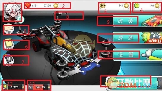 左侧代表现在当前车辆电池拥有的电量,右侧代表最大电量。点击“+”号进行充电,1点电量=1G,非锂电池充电会掉最大电量10点。(当开始游戏时候电量变为“0”的时候,恭喜您,屏幕会跳出:“未完成,请注意电量与耐久!再接再厉!”原因嘛大家懂得)