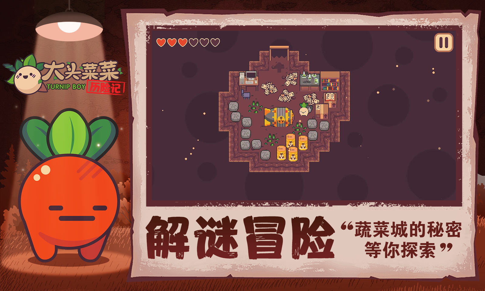 《大头菜菜历险记 完整版》这个版本能为呈现完整的剧情故事,进入其中各位能以可爱大头菜的身份来参与异世界的冒险,游戏上方的爱心数量就是你有几条命,你需要细致的把握好自己的状态,作为一款让人欲罢不能的休闲闯关游戏,你需要小心操作,自由穿梭在一个个精心设计的关卡之间,一边小心翼翼地避开敌人的袭击和陷阱,一边利用手中的武器保护自己并寻找隐藏的宝藏。每一次成功解锁大头菜的新技能,都像是获得了一份珍贵的礼物,激励着我继续前行,迎接更大的挑战。