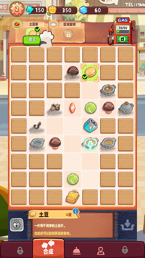 值得一提的是,旅行串串并没有在游戏的玩法上设置难度,游戏采用的是体力限制与合成消除相结合的玩法,小到蔬菜调料,大到锅碗瓢盆,游戏中所有的资源都可以通过合成消除的方式进行获取,首先通过合成建材的方式合成出生产工具,然后再通过消耗体力点击生产工具获得制作菜肴的原材料,已经产生的生产工具和原材料还可以通过二合一的方式升级为更高级的素材,玩家要做的就是通过合成完成顾客提交的各种订单就够了。
