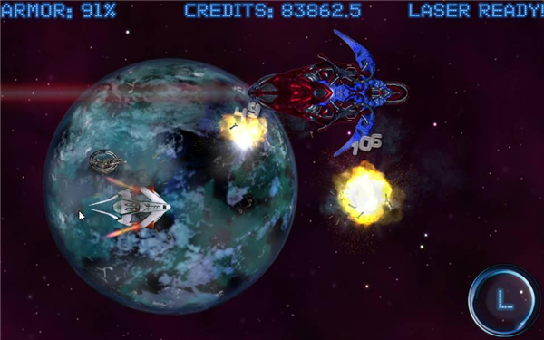 游戏背景是在浩瀚的太空中,你要对抗外来舰艇的冲击,避开它们的炮弹。你可以通过击毁敌人或者陨石得到积分,并且用积分来对自己的飞船进行升级。