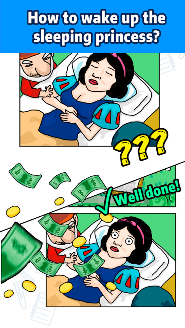 3、画风简单,音乐幽默,每一关的题目都很魔性恶搞,让玩家欲罢不能。