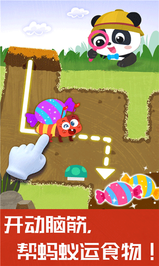 小蚂蚁要运美食回家!宝宝帮蚂蚁规划路线,把糖果、苹果成功运回家!土拨鼠迷路了,宝宝认真观察,带领土拨鼠穿越岩石迷宫,收集坚果,回到洞中。