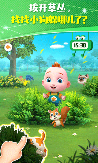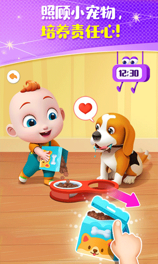 是谁在汪汪叫?是小狗Bingo!它的肚子快饿瘪了,需要进行喂食,宝宝来帮帮忙:撕开狗粮袋,倒满宠物餐盆。Bingo好像没吃饱?使用开罐器,再为它开一个宠物罐头吧。Bingo出去“兜风”咯!呀,它玩得一身脏,还需赶紧清洗:用夹子,清理Bingo身上的杂草;举起刷子,刷洗爪子上的泥块;为浴花挤上沐浴露,还能给Bingo做个泡泡Spa。