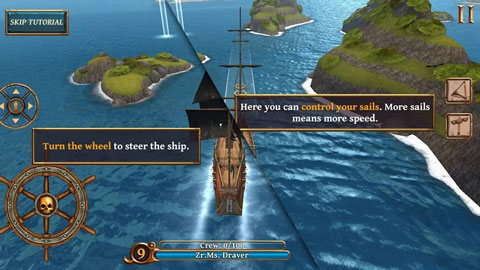 进入到战斗状态后玩家们首先要做的就是打开船帆只需要点击右侧的两个图标就可以行动了。因为船只可以单侧进攻所以玩家在发射炮弹攻击时一定要看好是哪一侧发射的炮弹,在屏幕左下角有一个船舵玩家需要通过转动船舵来让船改变方向,这个船舵就和汽车的方向盘操作是一样的他只可以转动180度,当松开手时会自动回正。在右下角是攻击按键,在他的边缘则是属性弹药,想用哪个点击就可以自用切换。