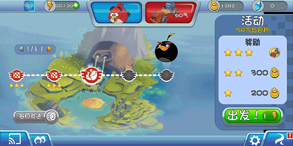 1、进入愤怒的小鸟卡丁车官方正版游戏之后,玩家们需要拉动小鸟来开始起步。
