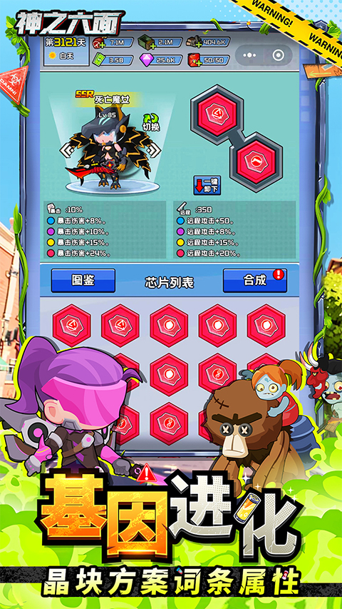 除此之外,神之六面游戏内的玩法也是非常简单的,玩家需要通过召集伙伴,然后通过升级角色、装备和进化基因等方式强化人物战斗力,在组建一支探索队伍,从而轻松的游玩游戏。同时游戏内玩家操控的角色靠近敌人会触发自动攻击,玩家需要通过灵活走完避开敌人的攻击,才能轻松取胜。在这里,神之六面邀你共同见证生存的力量,感受末世求生的刺激与激情,书写属于你的生存传奇!