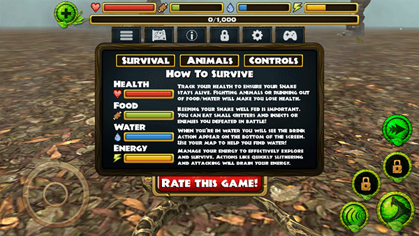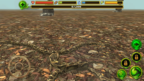 通过此游戏,你可以更加了解蟒蛇的生活习性,感受蟒蛇的视角,游戏拥有庞大的生态系统,其中有24个独特的丛林物种,你将会面临天敌,所以你在捕食的过程中也不要忘记注意查看天敌的所在,这样能够保证自己的存活率。此外,蟒蛇模拟器游戏还有健康值系统,你需要维持你的身心健康,饥饿度,口渴度和活力,要在敌对的森林里生存,随着生存时间长短,蟒蛇的等级也会上升,然后你可以升级你的蛇,以提升她们的健康,攻击伤害,乃至像开启毒液等新的能力。