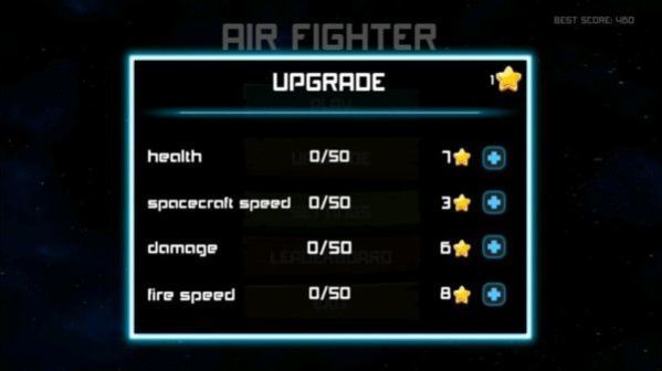 2、通过不断战斗收集小星星来提高战机的战斗能力。