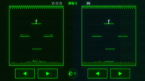 第二关就不一样了,有点小难度,在左边的方框中,玩家需要控制下方的飞机射杀敌机的小飞机、五边形的石头,注意别让敌机靠近,小心不要撞到陨石。而右边的方框中,你需要控制一个白色的小人,按住左右的按键可以控制小人左右活动,脚下的小木板会逐渐升起,如果挨到头顶的尖刺就会死掉,而随着这个木板的升起,会有其他的木板跟着从下匀速升起,我们要做的就是控制小人左右移动跳到下方的木板上,不断的向下使得小人不会坠地也不至于被头顶的尖刺万箭穿心。