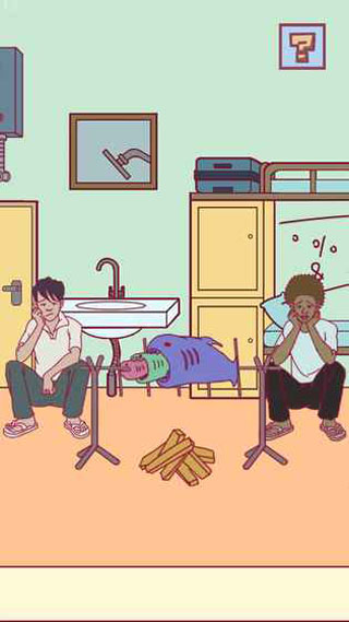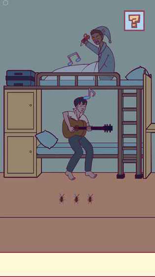 11、从上铺同学手中获得剪刀,从下面的柜子中获得猫,从行李箱获得杰瑞,将猫放在蟑螂右边,将杰瑞放在猫和蟑螂中间,等蟑螂被踩死,下铺同学放下吉他?的时候,用剪刀剪断琴弦。