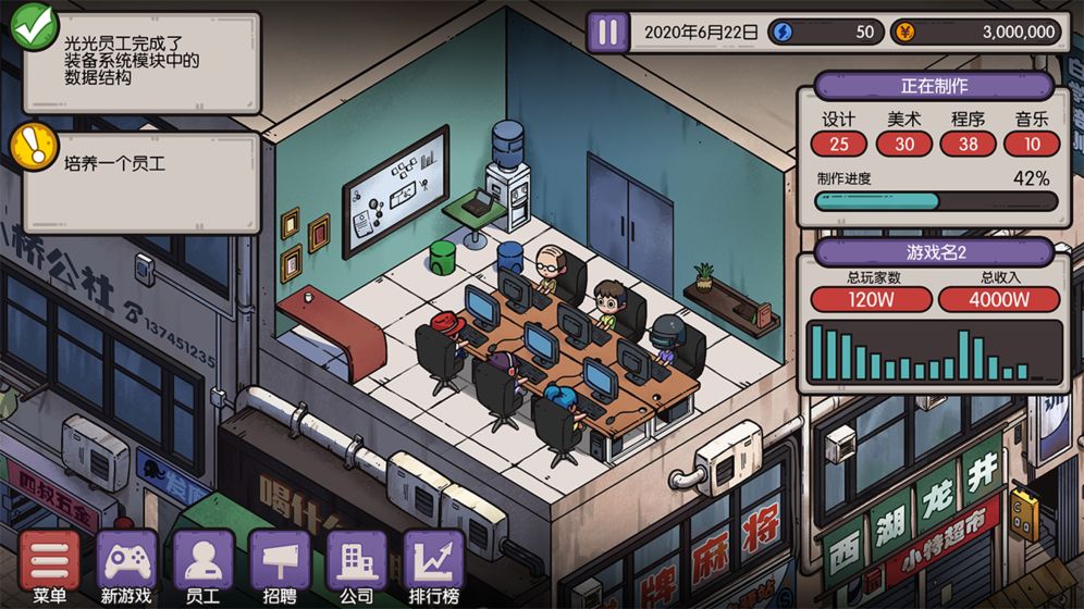 国产游戏公司模拟是一款非常有趣的经营游戏,开局玩家就会有一个公司