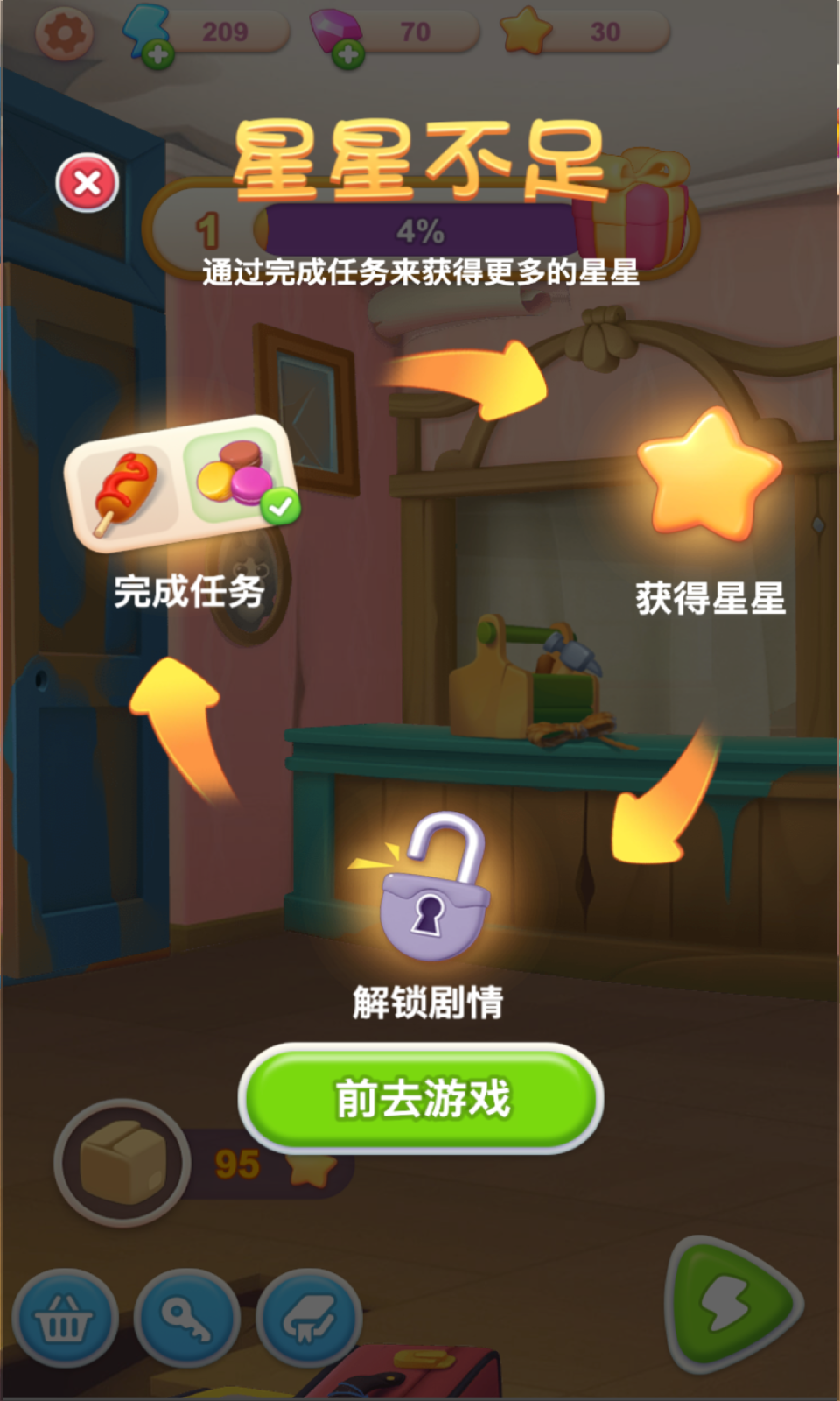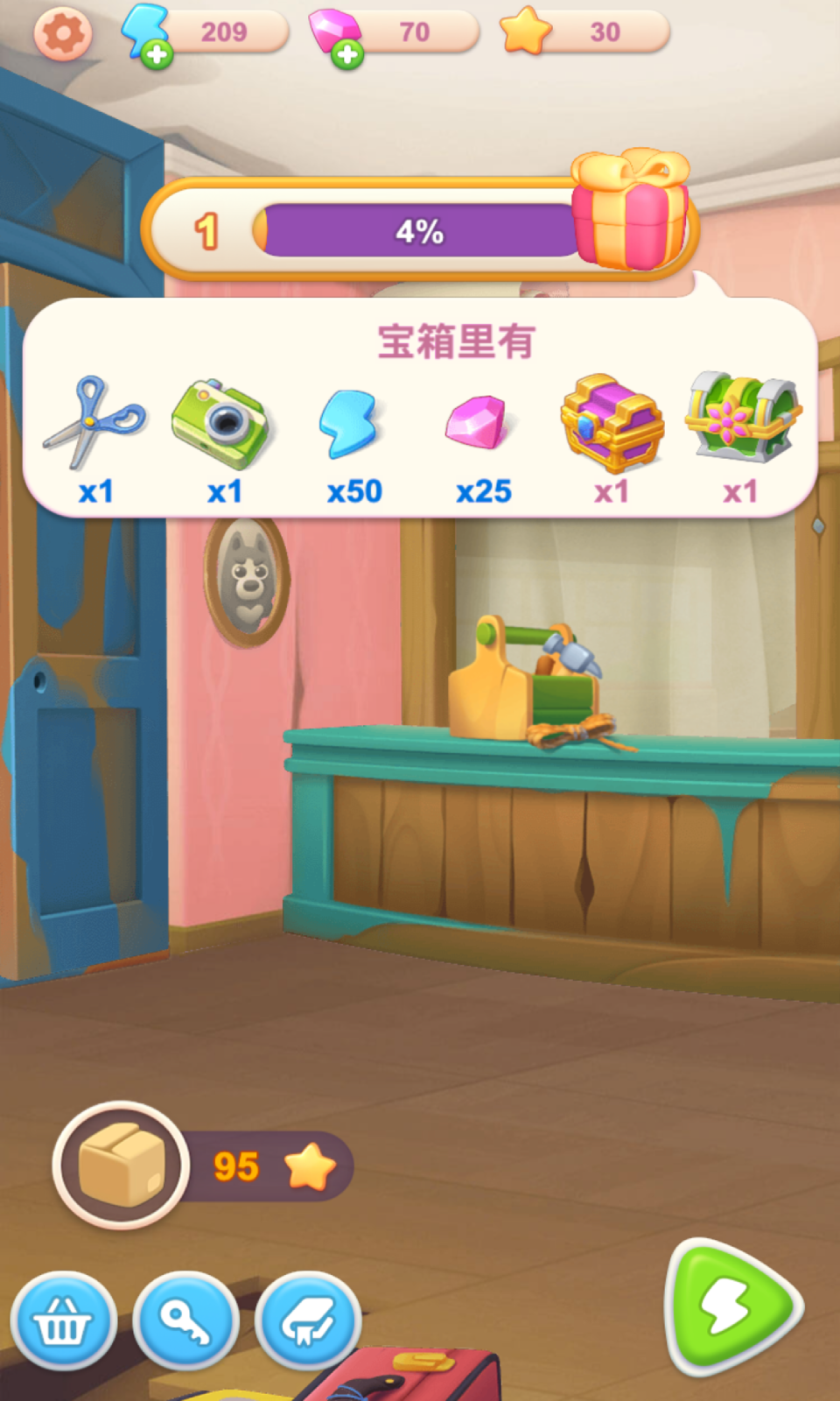 根据游戏的任务提示完成各种任务,获得装修的体力,可以完成旅馆的升级装修。