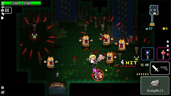炸裂树莓浆游戏整体节奏还算是比较快地,玩起来感觉有些爽快。玩法跟传统地牢类游戏,特别是同类型的带有roguelike元素的2D射击游戏差不多。所有关卡中的地图全都是随机生成,人物能够携带近战武器和远程武器两种,在流程中玩家可以通过收集怪物掉落的以及开宝箱获得的宝物提高角色的属性。