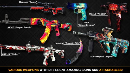 不同类型的武器和枪支,包括Karambit, AK47, M4A1,沙漠之鹰,万能狙击手,Mac10, tec-9等。