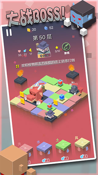 勇者别方安卓版是一款充满趣味性的休闲类探索手游,该游戏画面采用了3D立体风格,方块模样的世界格局呈现让整个游戏看起来有种战旗游戏的感觉,背景色调清新,色颜色搭配丰富,给人一种清晰亮丽的视觉感官体验。玩法上,勇者别方采用全屏滑动的操作方式,在这里玩家只需通过滑动手指来制定角色的前行路线,可以直线前行,也可以进行斜线行走。不过每一次只能走一格,开发人员在每一个楼层都加入了任务系统,每一次挑战除了要完成任务外,还要在规定步数内到达终点才能获得胜利。